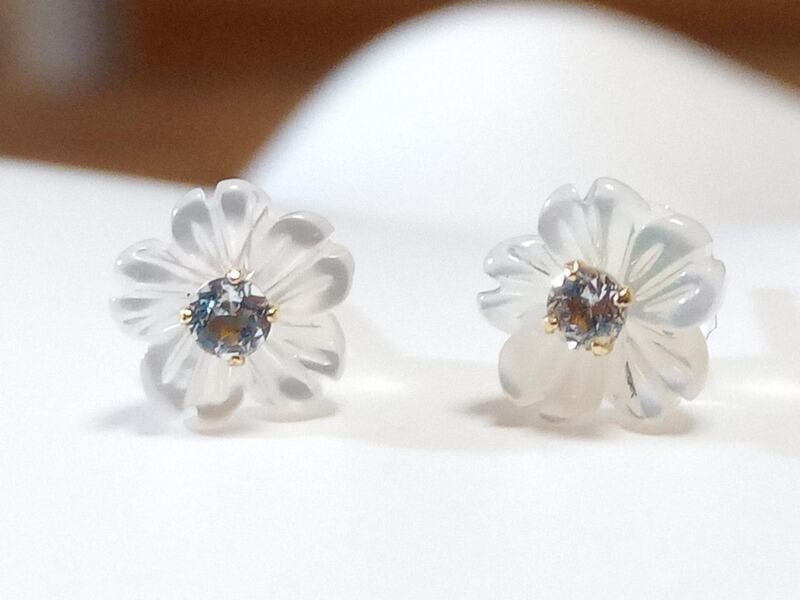 10金(K10、10K) ホワイトシェル&アクアマリン 2wayフラワー ピアス プレゼントにもどうぞ 小箱、La Terre表参道のショップバッグ付きです。レディース アクセサリー