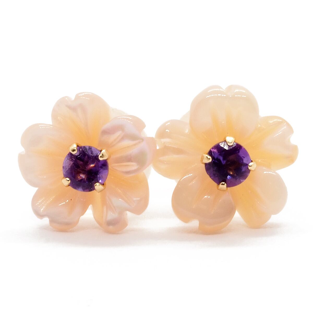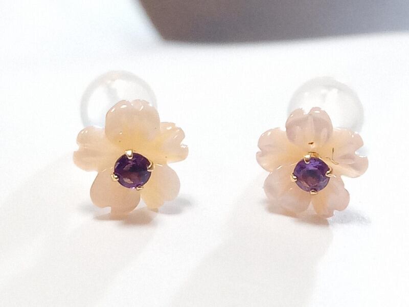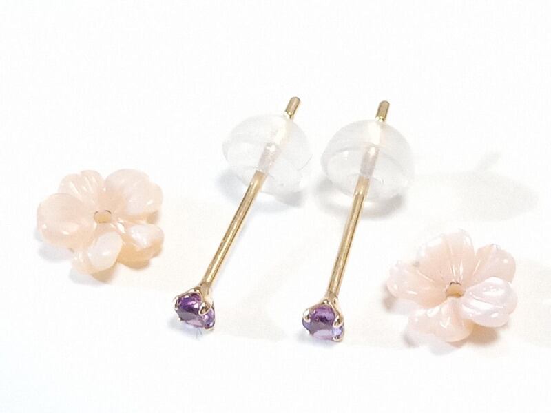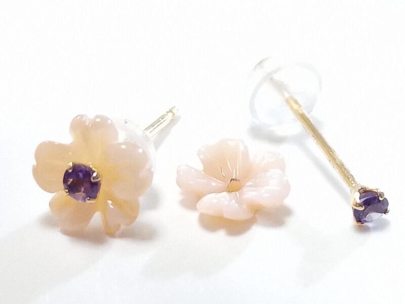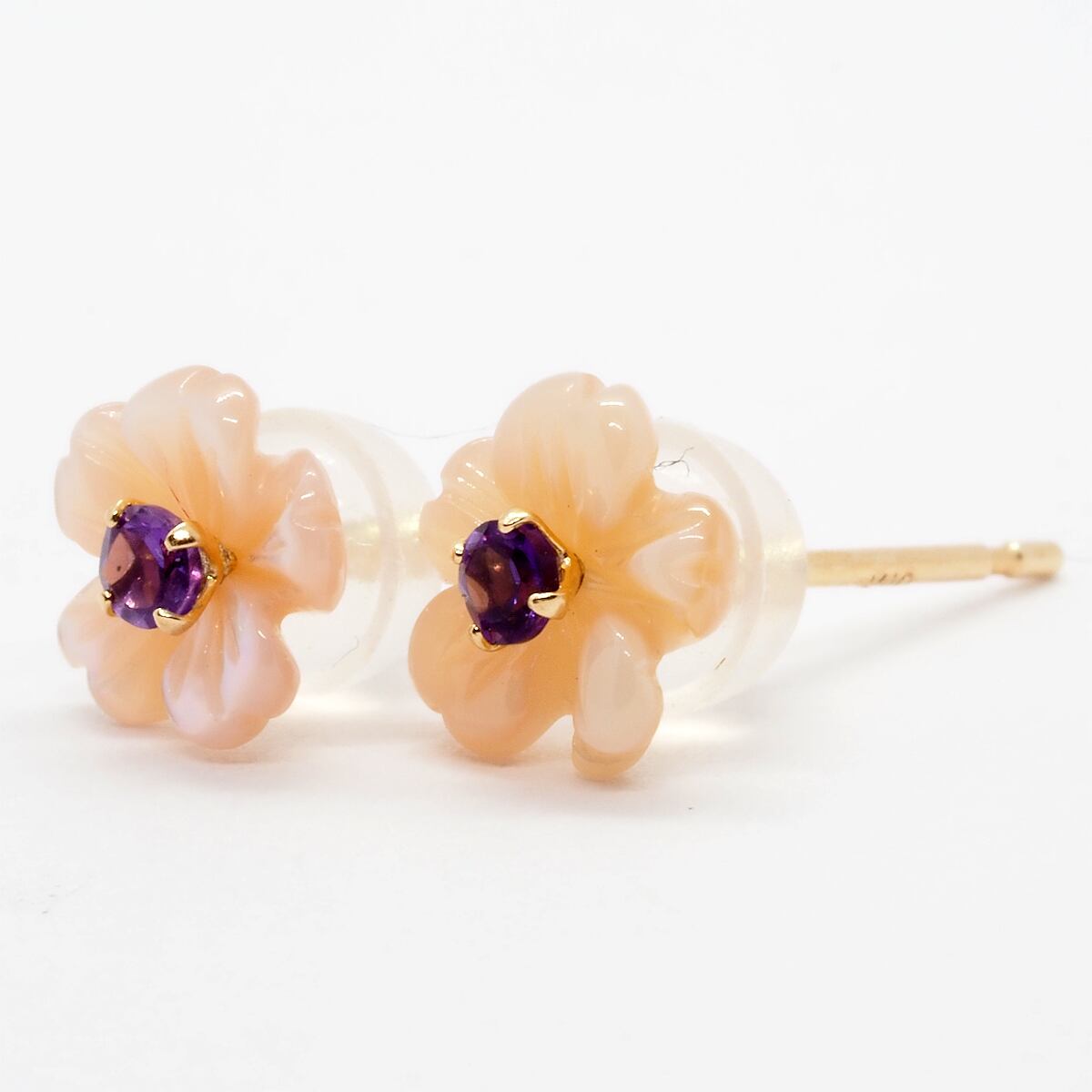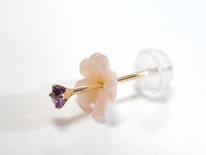 花びら部分はピンクシェル、センターのスタッドピアスはアメジストで