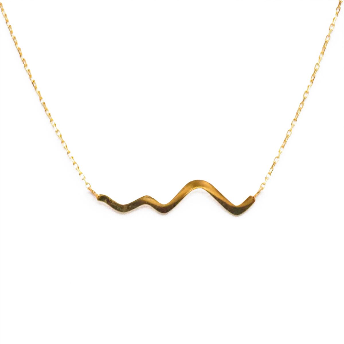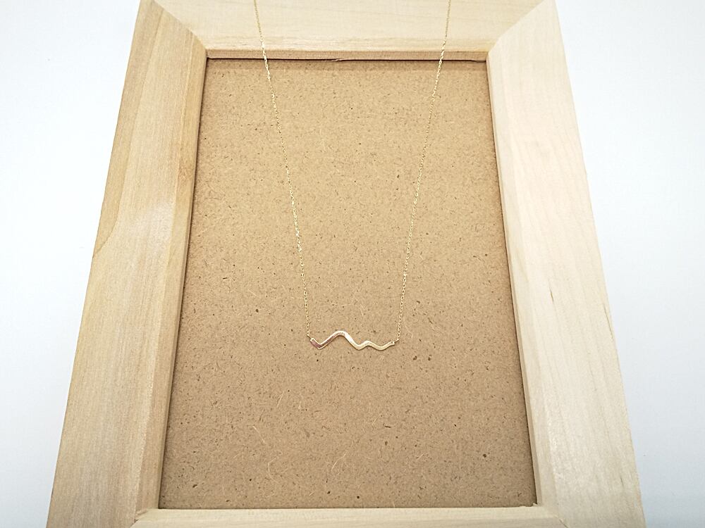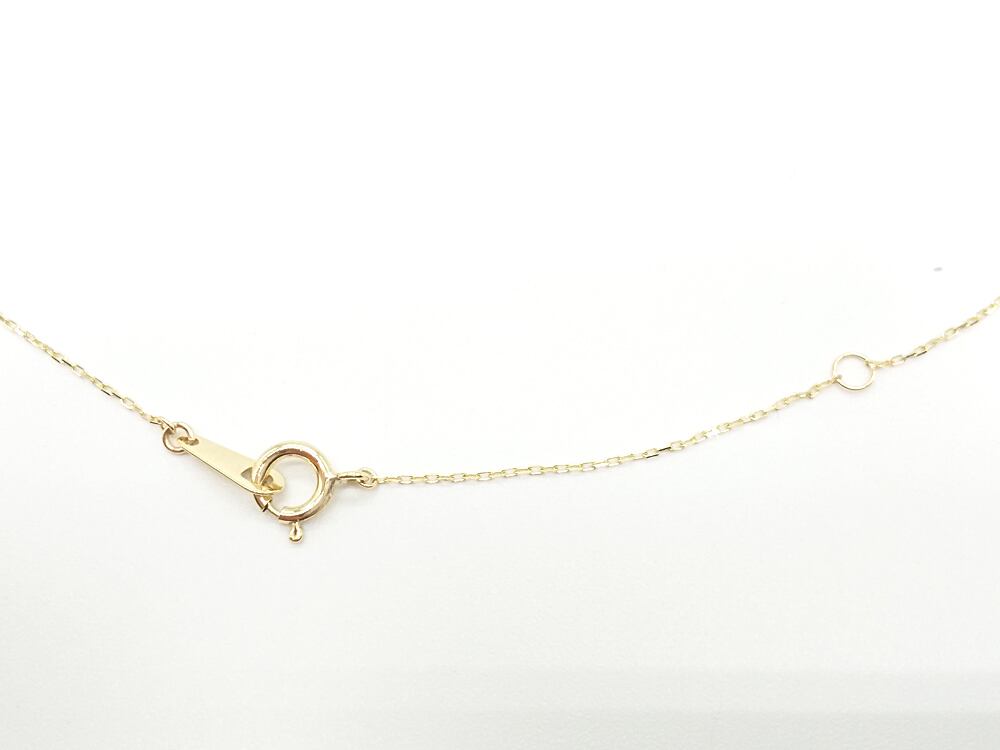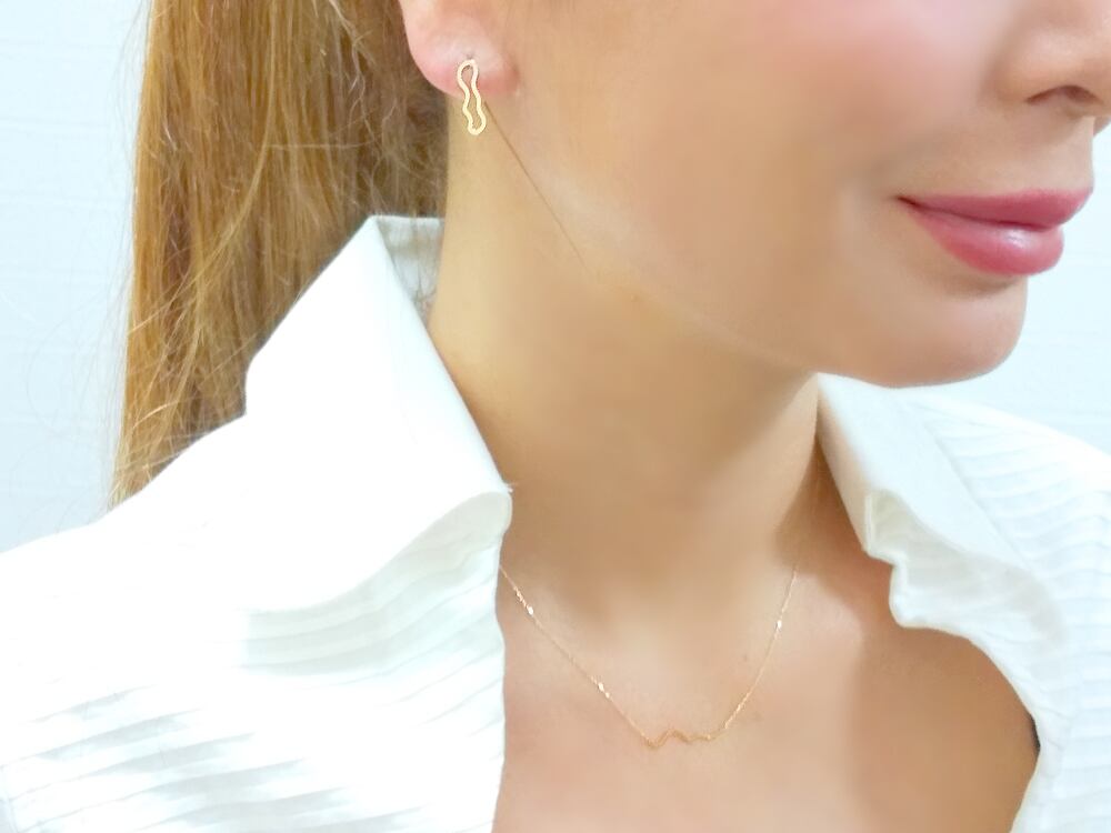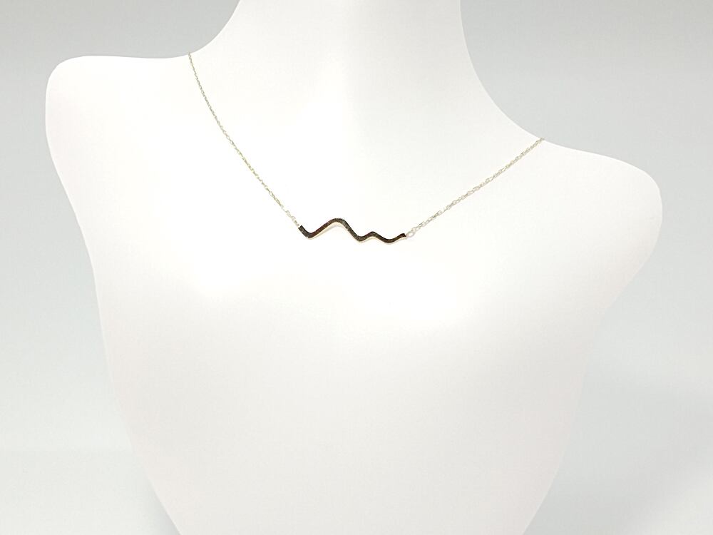 細い線でシンプルにデザインしました。 横のデザインなので、チョーカー気味に着けると素敵ですよ。 ピアスとのペアでも着けれらます。 トップ横全長約2cm。 ネックレスあずきチェーン全長約42cm。材質はK10です。