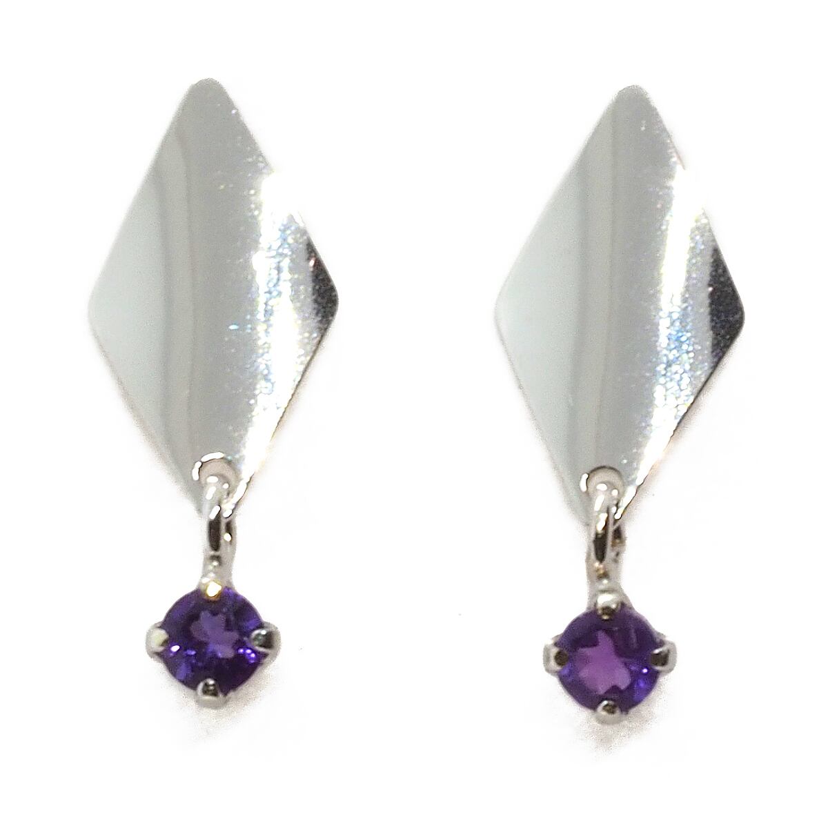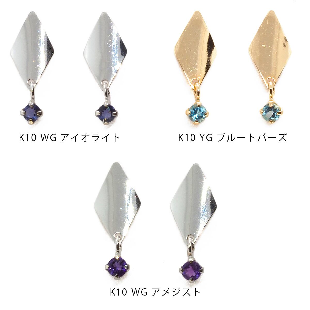 ひし形にデザインされた10金トップにアメジスト、ブルートパーズ、アイオライトがゆらゆら揺れる可愛らしいピアスです。